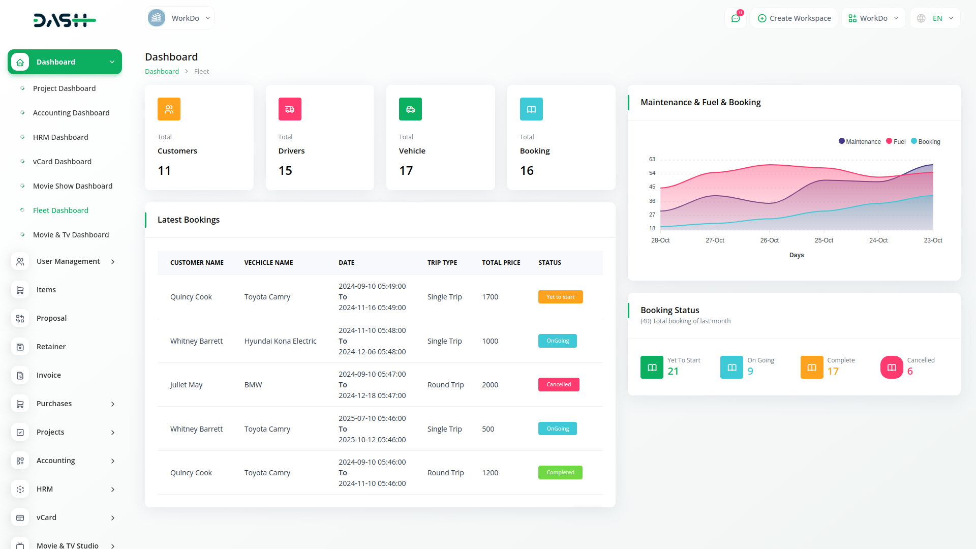 Fleet gives users deep insight into their maintenance needs with detailed Vehicle Bookings, Vehicles,Maintenance,insurance , dashboards